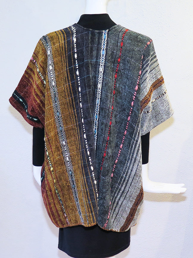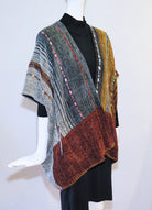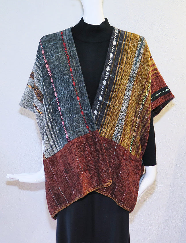 Nancy Paap's hand woven pieces are true originals - each one is lovingly and uniquely created with ribbons, laces, incredible color ways, and a superb finish in the craftsmanship. This "Long Kabuki" vest is draping nicely over the shoulders and is suitable for larger ladies. With two silk lined angled pockets on the sides, this vest is casual, easy to wear, but oh so special. This is One Size (up to 1 or 2x)