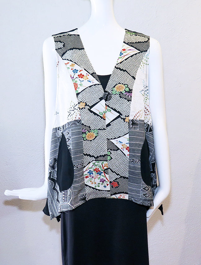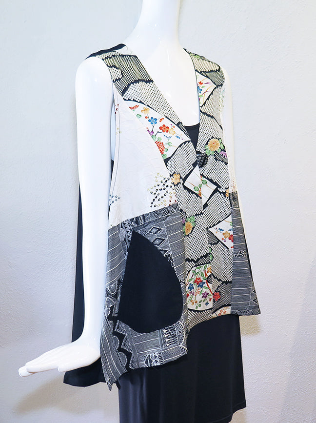 Yasuko creates each of these one-of-a-kind vests from vintage kimono textile. Single fabric covered button, teardrop shape slanted pockets, and a solid rayon back with pintuck detail and flattering drape. Perfect with one of our Body Bark layering tops for casual elegance over pants or a skirt. M/L - 44" bust; 23" front that dips to 30" in back.