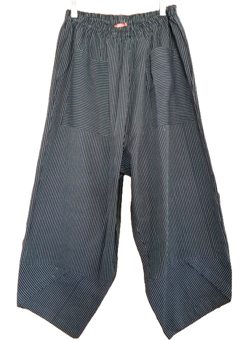 100% lightweight Tagai cotton pants. Patch pockets, elastic waistband. The fabric has thin white vertical thread stitching along the entire body and is cool and comfortable. Designed with a longer rise for an easy, slouchy fit; tapers at the ankle. S - 22" elastic waist, 22" inseam; M - 24" elastic waist, 22" inseam; L - 26" elastic waist, 22" inseam; XL - 28" elastic waist, 22" inseam