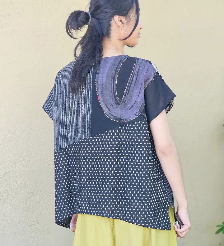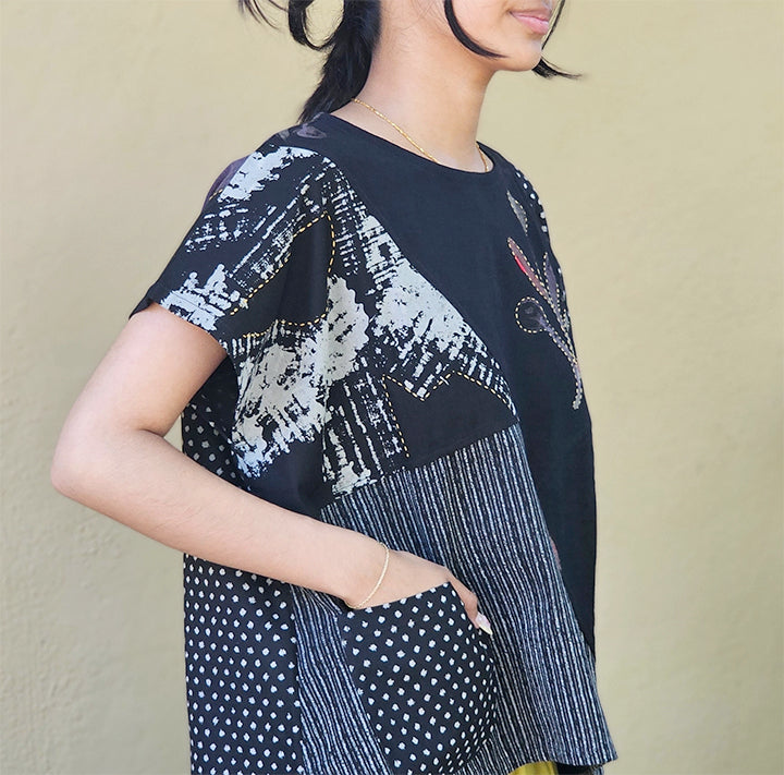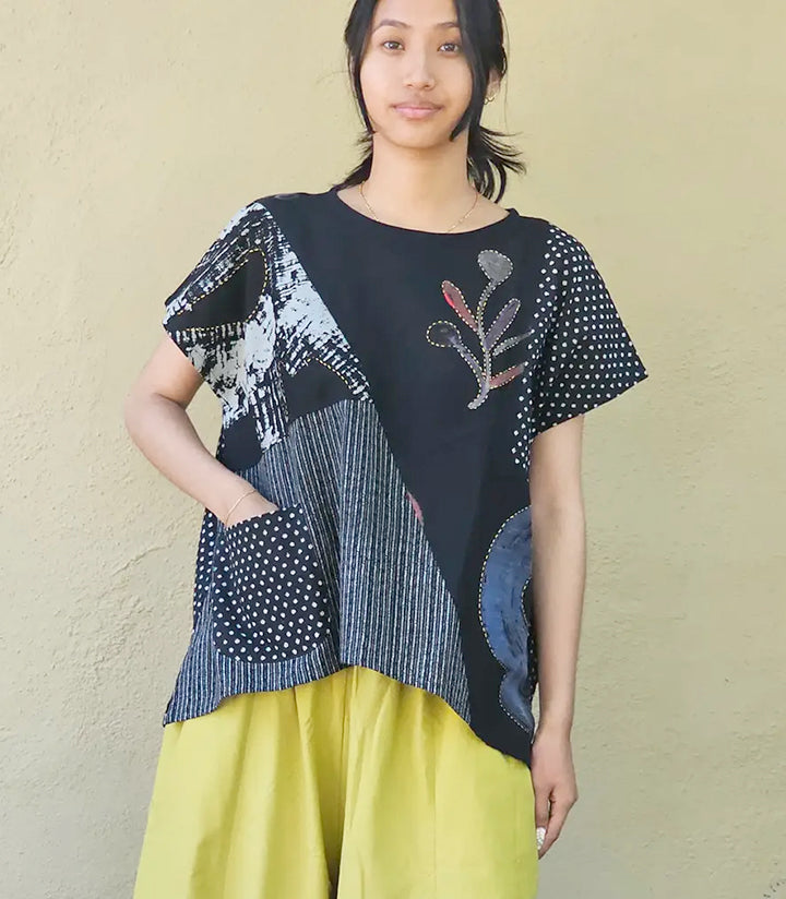 This Kasur Batik print pullover is a medium weight cotton with hand stitched overlay details on patchwork designs, a patch pocket and 5" side slits. 100% hand loomed cotton. S/M - 48" bust, 23" length in center front, a little longer on the sides and back; L/XL - 56" bust, 26" length in center front, a little longer on the sides and back