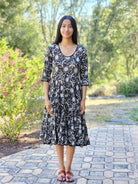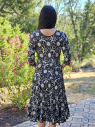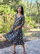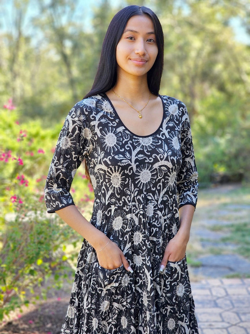 The Twirl dress is a lovely lightweight cotton fabric with a traditional wood block print design. Scoop neck, elbow length sleeves, and front pockets. It's cut on the bias, making it flattering on every body. Size S/M - 36" bust; M/L - 38" bust; 44" length