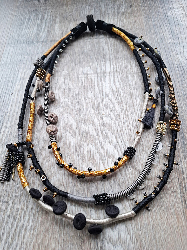 The Bedouin Necklace features three multicolored thread wrapped cords with a funky mix of beading and tassels. 21", 22" and 23" stepped strand length, snap closure. Handmade in Peru