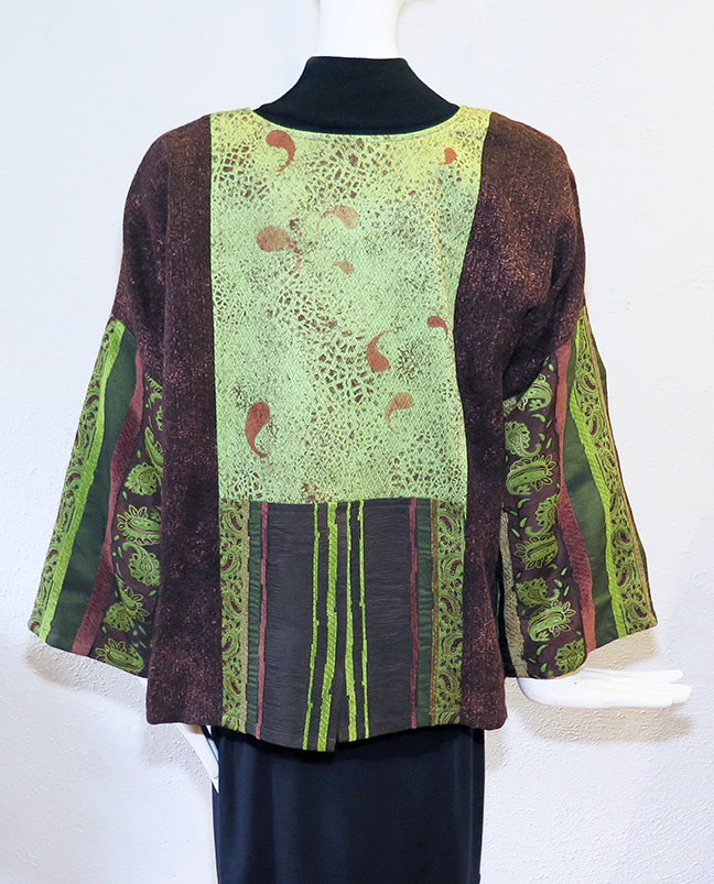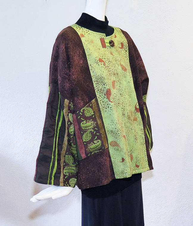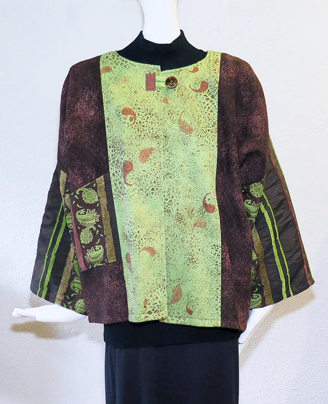 This one-of-a-kind jacket was thoughtfully created using a mix of lightweight fabrics and features a single button closure, 8" back slit, a single patch pocket, and dolman style bracelet length sleeves. Mint chip. Size M/L: 46" bust; 24" length