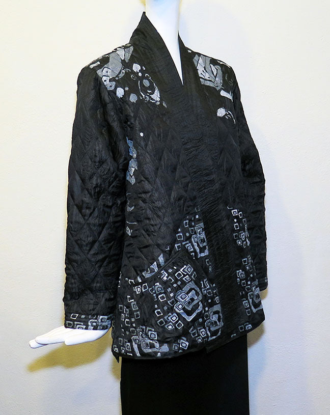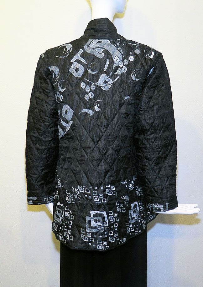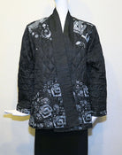 This lightly quilted puffy jacket is so fun and versatile! The perfect topper with boots and jeans or that casually elegant outfit. Black slightly A-line jacket with grey and white graphics, long sleeves, 5" side slits, a contrasting shawl collar, accent pocket and open front. M - 40" bust; 26" length in front, dipping slightly in back. Hand or machine wash delicate