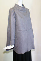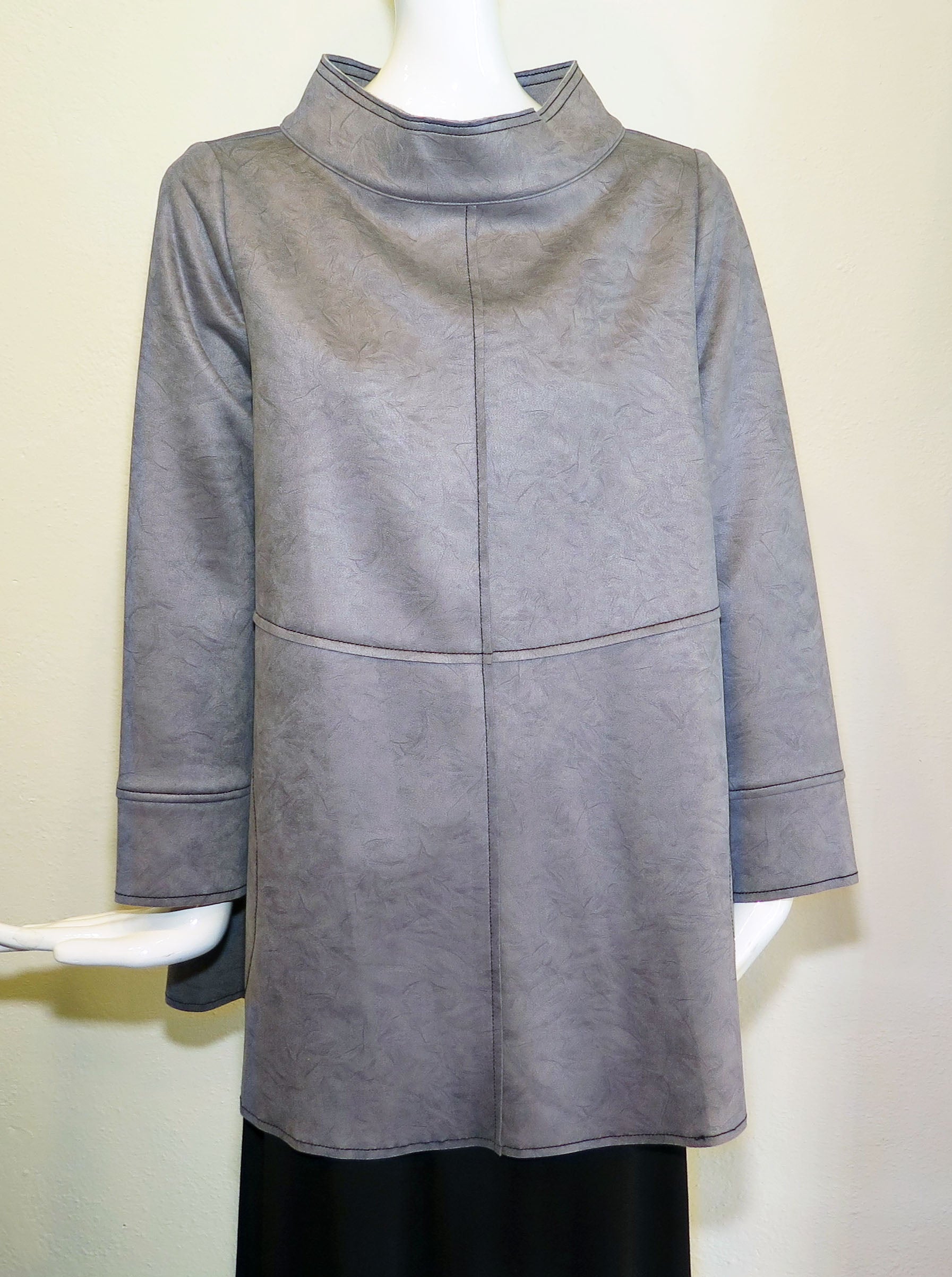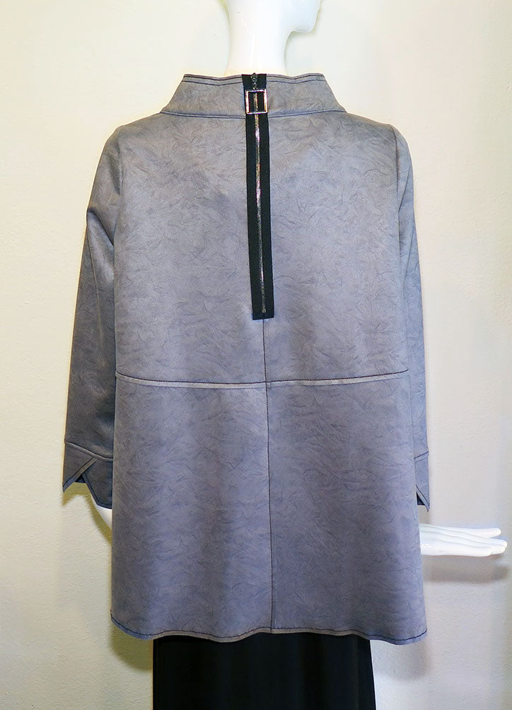 These faux suede tops from IC Collection offer simple elegance, taking you easily from office to evening. Contemporary style in a buttery soft faux suede; high neck, notched overlapping cuff with contrast stitching, back zipper and pockets. Polyester/spandex. Dry clean recommended. S - 40" bust; M - 42" bust; L - 44" bust; 28" overall length