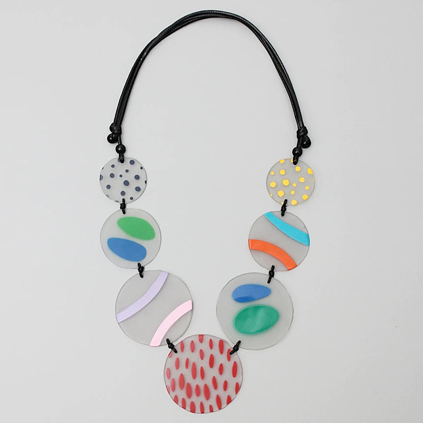 This colorful Regan necklace features round frosted resin beads hand painted, each with its own unique design. The beads are strung in size order on an adjustable black wax cord. Layer this lightweight necklace over a solid tee or dress to make your outfit pop.