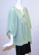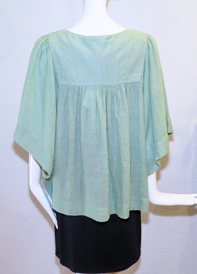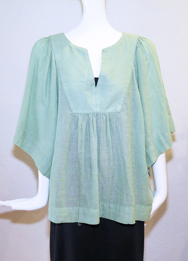This linen top is loaded with romance! 100% lightweight linen gauze top with poet shirt sleeves, a notched V-neckline and pintucks front and back. Delicate wash and hang to dry. XS - 38" bust; S - 40" bust; M - 42" bust; L - 44"; 24 overall length